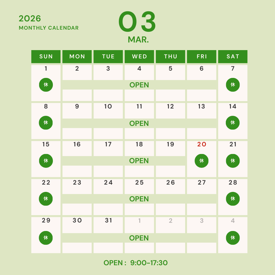 ■営業時間:9:00~17:30 ■定休日:土曜・日曜・祝日 |
